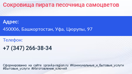 Сокровища пирата, песочница самоцветов по адресу 450006, Башкортостан, Уфа, Цюрупы, 97 в дальнейшем Организация, размещена в следующих категориях: