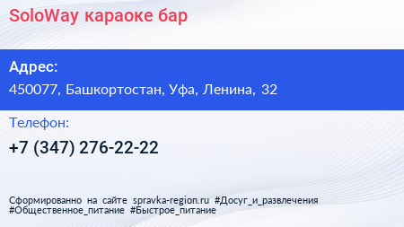 SoloWay, караоке-бар по адресу 450077, Башкортостан, Уфа, Ленина, 32 в дальнейшем Организация, размещена в следующих категориях: