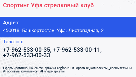 Спортинг Уфа, стрелковый клуб по адресу 450018, Башкортостан, Уфа, Листопадная, 2 в дальнейшем Организация, размещена в следующих категориях:
