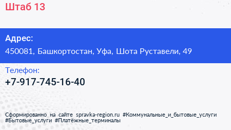 Штаб 13 по адресу 450081, Башкортостан, Уфа, Шота Руставели, 49 в дальнейшем Организация, размещена в следующих категориях: