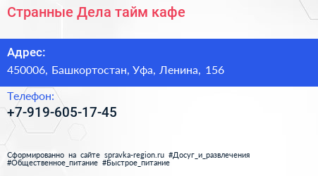 Странные Дела, тайм-кафе по адресу 450006, Башкортостан, Уфа, Ленина, 156 в дальнейшем Организация, размещена в следующих категориях:
