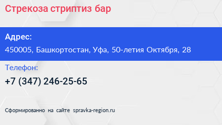 Стрекоза, стриптиз-бар по адресу 450005, Башкортостан, Уфа, 50-летия Октября, 28 в дальнейшем Организация, размещена в следующих категориях: