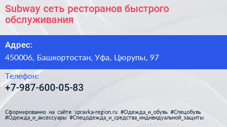 Subway, сеть ресторанов быстрого обслуживания по адресу 450006, Башкортостан, Уфа, Цюрупы, 97 в дальнейшем Организация, размещена в следующих категориях: