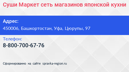 Суши-Маркет, сеть магазинов японской кухни по адресу 450006, Башкортостан, Уфа, Цюрупы, 97 в дальнейшем Организация, размещена в следующих категориях: