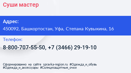 Суши мастер по адресу 450092, Башкортостан, Уфа, Степана Кувыкина, 16 в дальнейшем Организация, размещена в следующих категориях:
