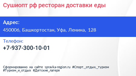 Сушиопт.рф, ресторан доставки еды по адресу 450006, Башкортостан, Уфа, Ленина, 128 в дальнейшем Организация, размещена в следующих категориях: