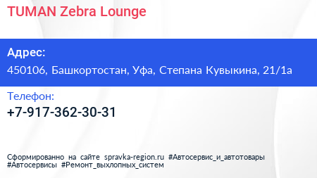 TUMAN & Zebra Lounge по адресу 450106, Башкортостан, Уфа, Степана Кувыкина, 21/1а в дальнейшем Организация, размещена в следующих категориях: