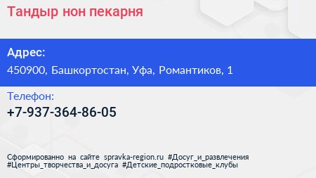 Тандыр нон, пекарня по адресу 450900, Башкортостан, Уфа, Романтиков, 1 в дальнейшем Организация, размещена в следующих категориях: