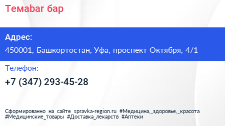 Темаbar, бар по адресу 450001, Башкортостан, Уфа, проспект Октября, 4/1 в дальнейшем Организация, размещена в следующих категориях: