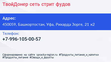 ТвойДонер, сеть стрит-фудов по адресу 450059, Башкортостан, Уфа, Рихарда Зорге, 21 к2 в дальнейшем Организация, размещена в следующих категориях: