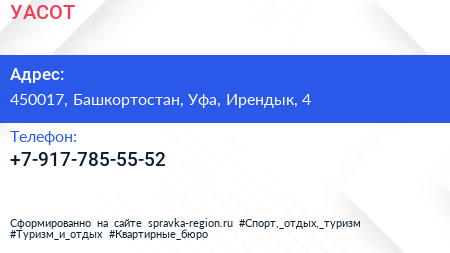 УАСОТ по адресу 450017, Башкортостан, Уфа, Ирендык, 4 в дальнейшем Организация, размещена в следующих категориях: