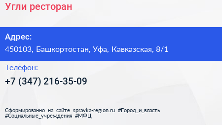 Угли, ресторан по адресу 450103, Башкортостан, Уфа, Кавказская, 8/1 в дальнейшем Организация, размещена в следующих категориях: