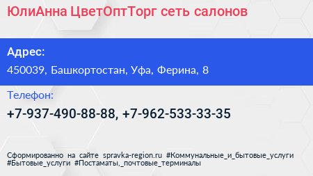 ЮлиАнна & ЦветОптТорг, сеть салонов по адресу 450039, Башкортостан, Уфа, Ферина, 8 в дальнейшем Организация, размещена в следующих категориях: