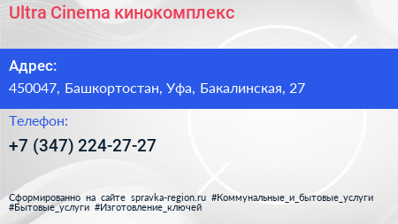 Ultra Cinema, кинокомплекс по адресу 450047, Башкортостан, Уфа, Бакалинская, 27 в дальнейшем Организация, размещена в следующих категориях: