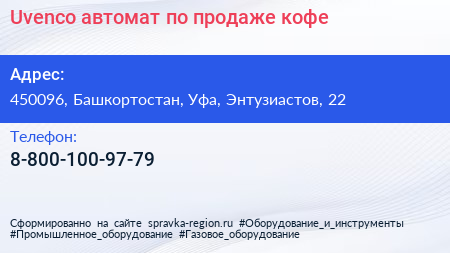 Uvenco, автомат по продаже кофе по адресу 450096, Башкортостан, Уфа, Энтузиастов, 22 в дальнейшем Организация, размещена в следующих категориях:
