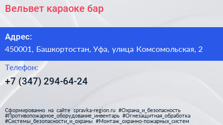 Вельвет, караоке-бар по адресу 450001, Башкортостан, Уфа, улица Комсомольская, 2 в дальнейшем Организация, размещена в следующих категориях: