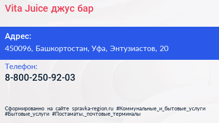 Vita Juice, джус-бар по адресу 450096, Башкортостан, Уфа, Энтузиастов, 20 в дальнейшем Организация, размещена в следующих категориях: