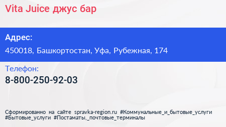 Vita Juice, джус-бар по адресу 450018, Башкортостан, Уфа, Рубежная, 174 в дальнейшем Организация, размещена в следующих категориях: