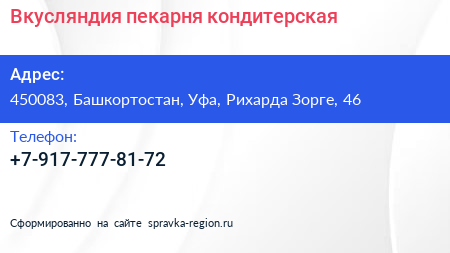 Вкусляндия, пекарня-кондитерская по адресу 450083, Башкортостан, Уфа, Рихарда Зорге, 46 в дальнейшем Организация, размещена в следующих категориях: