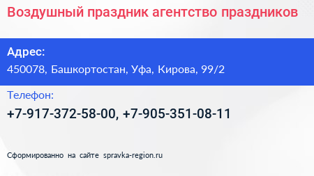 Воздушный праздник, агентство праздников по адресу 450078, Башкортостан, Уфа, Кирова, 99/2 в дальнейшем Организация, размещена в следующих категориях: