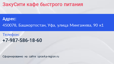 ЗакуСити, кафе быстрого питания по адресу 450078, Башкортостан, Уфа, улица Мингажева, 90 к1 в дальнейшем Организация, размещена в следующих категориях: