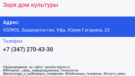 Заря, дом культуры по адресу 450901, Башкортостан, Уфа, Юрия Гагарина, 21 в дальнейшем Организация, размещена в следующих категориях: