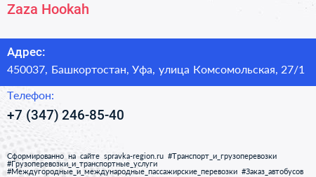 Zaza Hookah по адресу 450037, Башкортостан, Уфа, улица Комсомольская, 27/1 в дальнейшем Организация, размещена в следующих категориях: