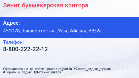 Зенит, букмекерская контора по адресу 450078, Башкортостан, Уфа, Айская, 69/2а в дальнейшем Организация, размещена в следующих категориях:
