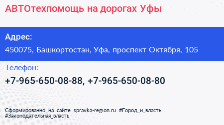 АВТОтехпомощь на дорогах Уфы по адресу 450075, Башкортостан, Уфа, проспект Октября, 105 в дальнейшем Организация, размещена в следующих категориях: