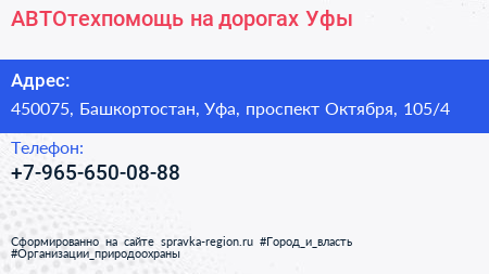 АВТОтехпомощь на дорогах Уфы по адресу 450075, Башкортостан, Уфа, проспект Октября, 105/4 в дальнейшем Организация, размещена в следующих категориях: