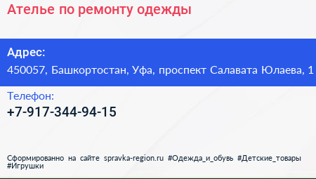 Ателье по ремонту одежды по адресу 450057, Башкортостан, Уфа, проспект Салавата Юлаева, 1 в дальнейшем Организация, размещена в следующих категориях:
