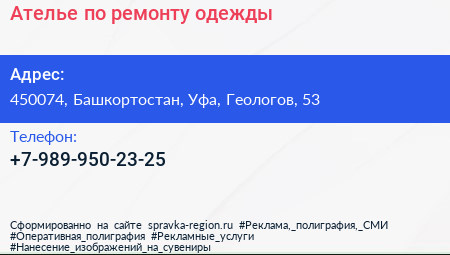 Ателье по ремонту одежды по адресу 450074, Башкортостан, Уфа, Геологов, 53 в дальнейшем Организация, размещена в следующих категориях: