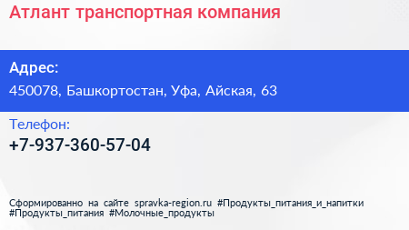 Атлант, транспортная компания по адресу 450078, Башкортостан, Уфа, Айская, 63 в дальнейшем Организация, размещена в следующих категориях:
