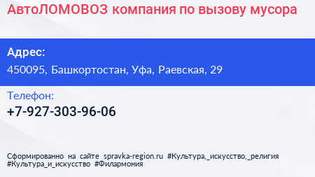 АвтоЛОМОВОЗ, компания по вызову мусора по адресу 450095, Башкортостан, Уфа, Раевская, 29 в дальнейшем Организация, размещена в следующих категориях: