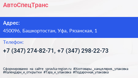 АвтоСпецТранс по адресу 450096, Башкортостан, Уфа, Рязанская, 1 в дальнейшем Организация, размещена в следующих категориях: