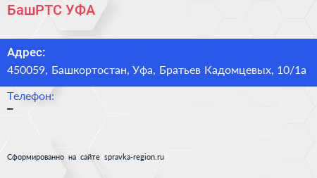 БашРТС-УФА по адресу 450059, Башкортостан, Уфа, Братьев Кадомцевых, 10/1а в дальнейшем Организация, размещена в следующих категориях: