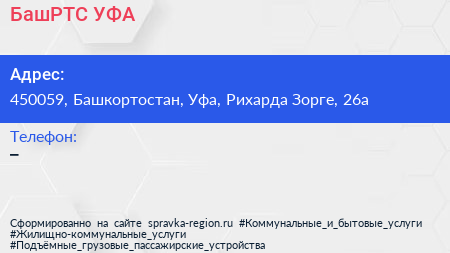 БашРТС-УФА по адресу 450059, Башкортостан, Уфа, Рихарда Зорге, 26а в дальнейшем Организация, размещена в следующих категориях: