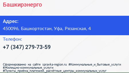 Башкирэнерго по адресу 450096, Башкортостан, Уфа, Рязанская, 4 в дальнейшем Организация, размещена в следующих категориях: