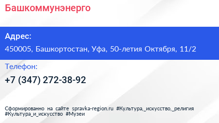 Башкоммунэнерго по адресу 450005, Башкортостан, Уфа, 50-летия Октября, 11/2 в дальнейшем Организация, размещена в следующих категориях: