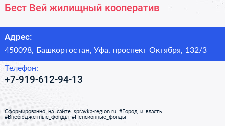 Бест Вей, жилищный кооператив по адресу 450098, Башкортостан, Уфа, проспект Октября, 132/3 в дальнейшем Организация, размещена в следующих категориях: