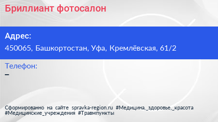 Бриллиант, фотосалон по адресу 450065, Башкортостан, Уфа, Кремлёвская, 61/2 в дальнейшем Организация, размещена в следующих категориях: