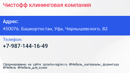 Чистофф, клининговая компания по адресу 450076, Башкортостан, Уфа, Чернышевского, 82 в дальнейшем Организация, размещена в следующих категориях: