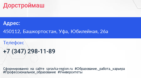 Дорстроймаш по адресу 450112, Башкортостан, Уфа, Юбилейная, 26а в дальнейшем Организация, размещена в следующих категориях: