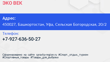 ЭКО ВЕК по адресу 450027, Башкортостан, Уфа, Сельская Богородская, 20/2 в дальнейшем Организация, размещена в следующих категориях: