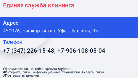 Единая служба клининга по адресу 450076, Башкортостан, Уфа, Пушкина, 35 в дальнейшем Организация, размещена в следующих категориях: