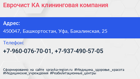 Еврочист-КА, клининговая компания по адресу 450047, Башкортостан, Уфа, Бакалинская, 25 в дальнейшем Организация, размещена в следующих категориях: