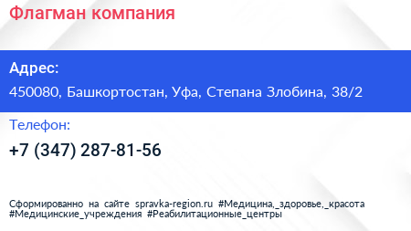 Для связи с организацией воспользуйтесь номером телефона: +7 (347) 287-81-56. Пн: c 09:00-18:00, Вт: c 09:00-18:00, Ср: c 09:00-18:00, Чт: c 09:00-18:00, Пт: c 09:00-18:00, Сб: выходной, Вс: выходной, вы можете обратиться в эту организацию.