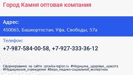 Город Камня, оптовая компания по адресу 450065, Башкортостан, Уфа, Свободы, 57а в дальнейшем Организация, размещена в следующих категориях: