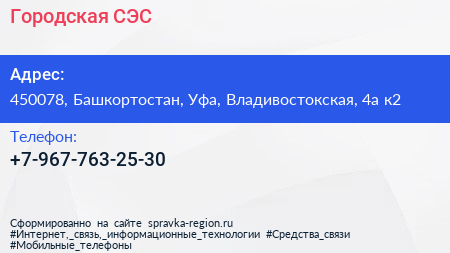 Городская СЭС по адресу 450078, Башкортостан, Уфа, Владивостокская, 4а к2 в дальнейшем Организация, размещена в следующих категориях: