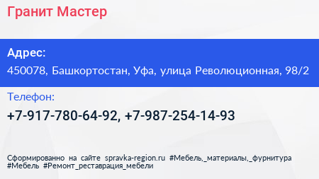 Гранит-Мастер по адресу 450078, Башкортостан, Уфа, улица Революционная, 98/2 в дальнейшем Организация, размещена в следующих категориях: